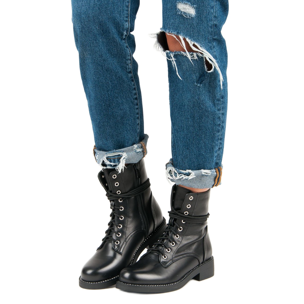 Workery mają płaski obcas o wysokości 3,5 cm oraz bieżnikowaną podeszwę, co gwarantuje stabilność i przyczepność na różnych nawierzchniach. Wykonane z ekologicznej, lekko połyskującej skóry w eleganckim czarnym kolorze, idealnie wpasowują się w każdą stylizację, od casualowych po bardziej eleganckie.