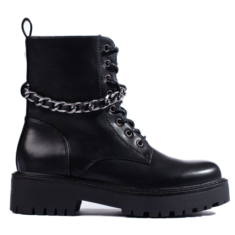 Eleganckie i wygodne workery w czarnym kolorze, łączące casualowy i rockowy styl. Wykonane ze skóry ekologicznej, ocieplane wkładką typu „koc obuwniczy”, idealne na chłodniejsze dni jesieni i zimy. Ozdobny łańcuszek dodaje charakteru, a praktyczne zapięcie na zamek i sznurowanie zapewnia łatwe zakładanie oraz dopasowanie do stopy.