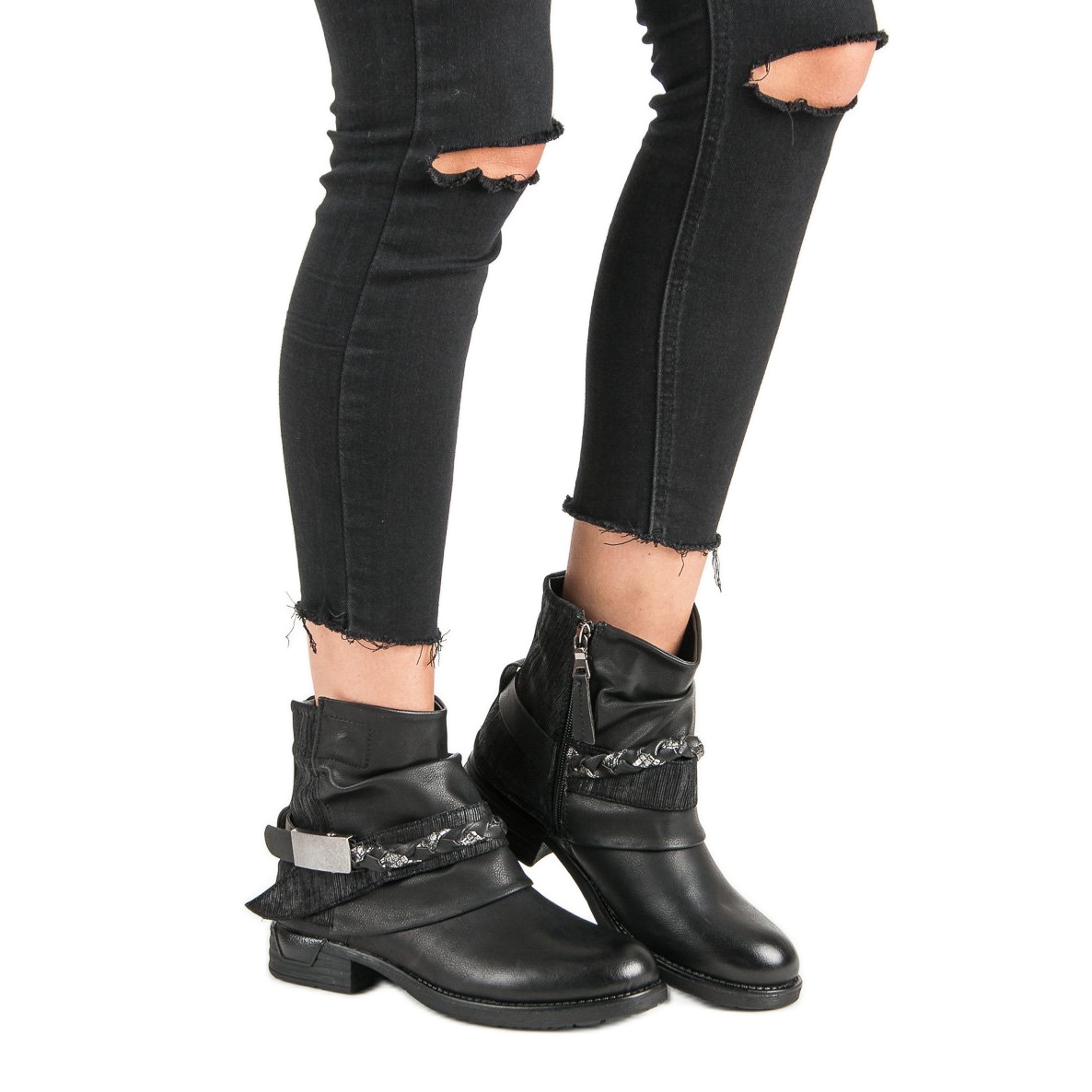 Ten model wyróżnia się nie tylko funkcjonalnością, ale i oryginalnym designem. Górna część butów została wzbogacona różnymi fakturami skóry, co dodaje im wyjątkowego charakteru. Dodatkowym atutem jest stylowy pas-warkocz z ozdobną sprzączką, który podkreśla rockową estetykę. Płaski obcas o wysokości 3 cm sprawia, że workery są niezwykle komfortowe podczas użytkowania, idealne do codziennych stylizacji.