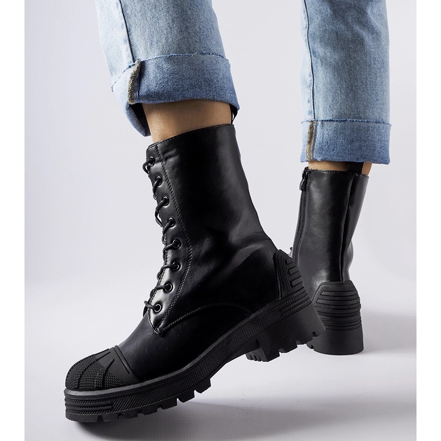 Czarne workery Manara to ocieplane, przykuwające wzrok botki damskie o modernistycznym charakterze. Wykonane ze skóry ekologicznej, wyposażone w sznurowanie i zamek błyskawiczny — idealne na sezon jesień–zima.