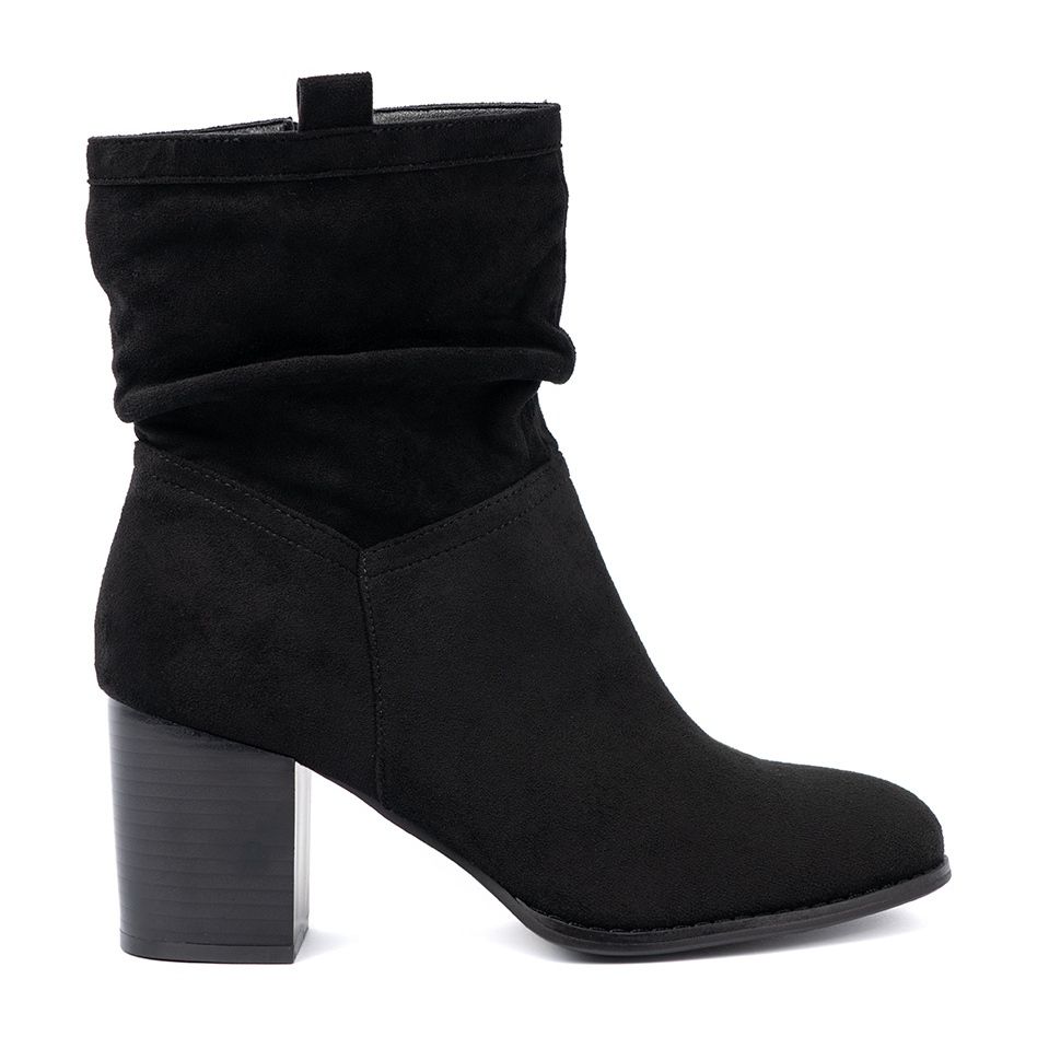 Szczegóły: Shelvt Czarne zamszowe botki na słupku z marszczoną cholewką