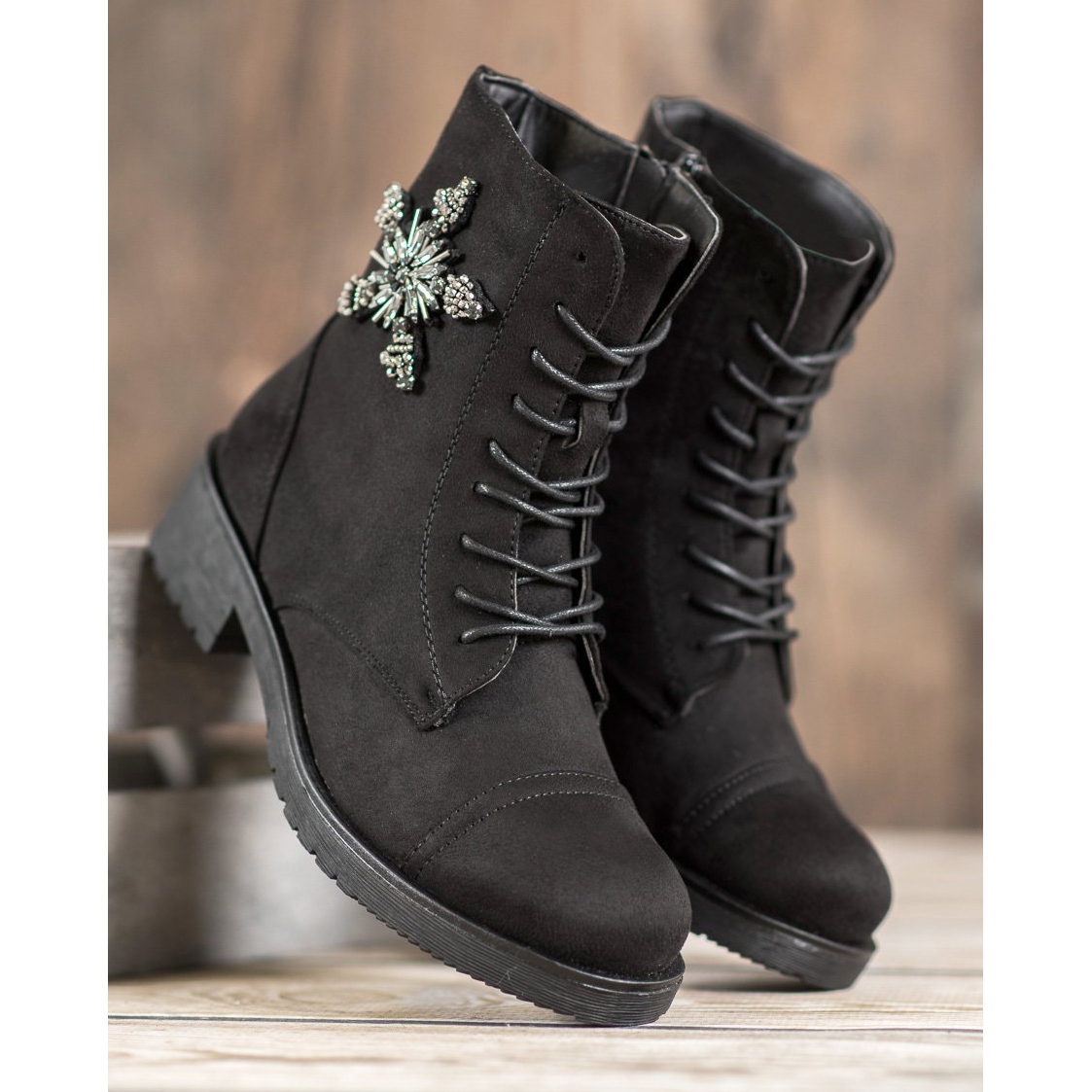 Odkryj wyjątkową elegancję i styl z czarnymi zamszowymi botkami SHELOVET. Wykonane z wysokiej jakości ekologicznego zamszu, te modne buty damskie są doskonałym wyborem na jesienne dni. Ich sznurowana konstrukcja oraz oryginalne, cekinowe zdobienia przyciągają wzrok, dodając każdej stylizacji niepowtarzalnego charakteru.
