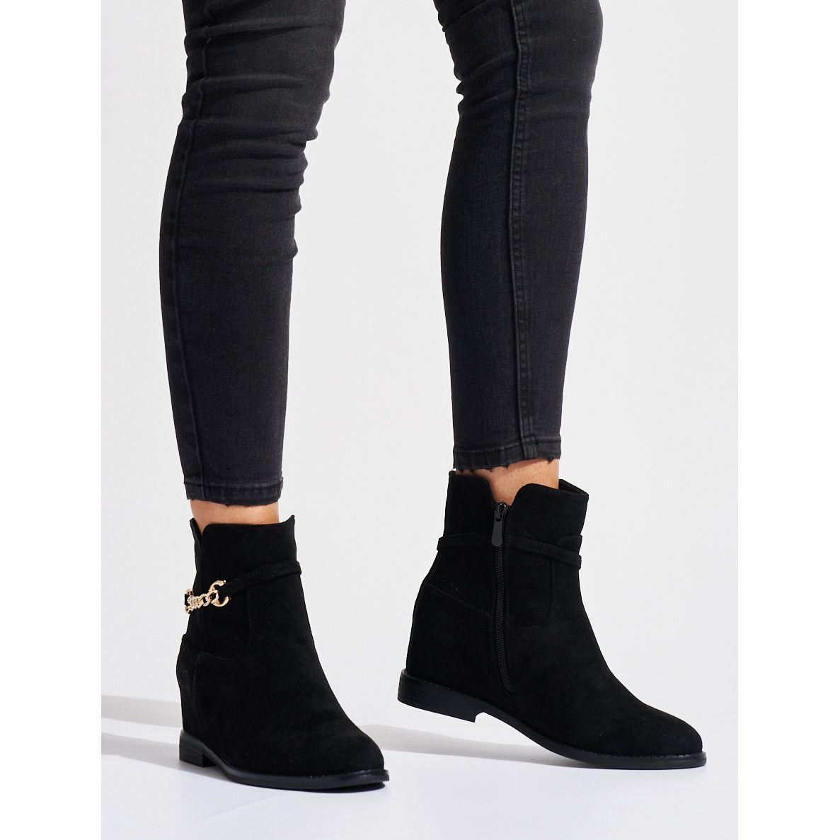 Szczegóły: Czarne zamszowe botki z łańcuszkiem
