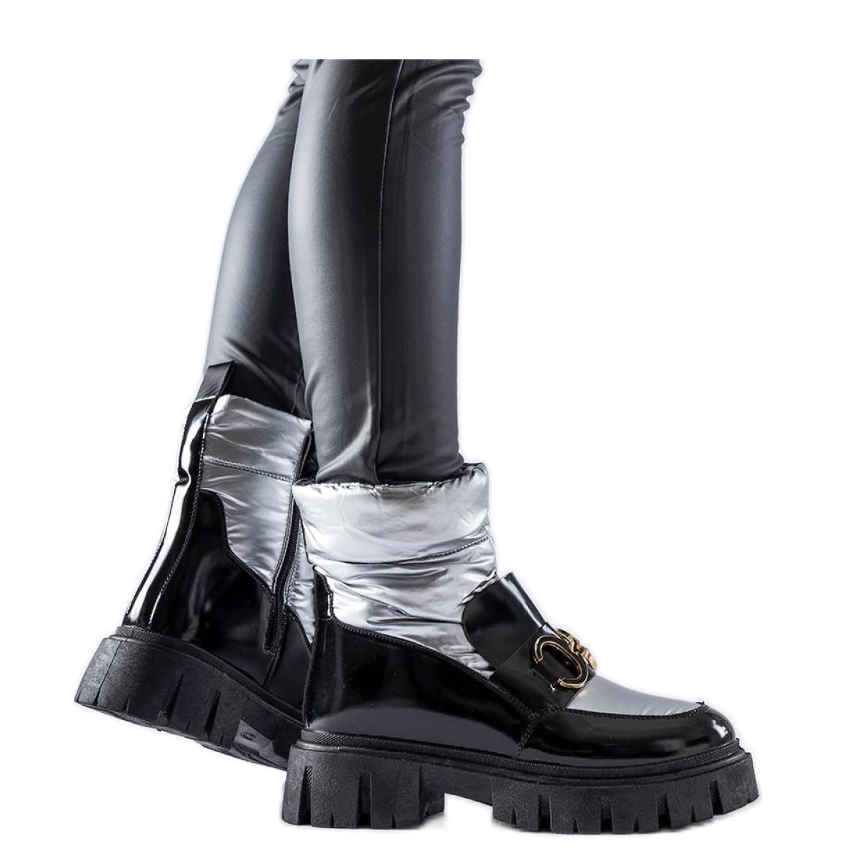 Szczegóły: Czarno-srebrne lakierowane śniegowce czarne