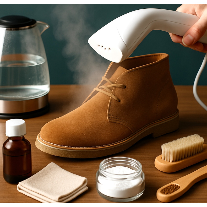 Para wodna działa jak magia na zamszowych butach. Trzymaj but nad parującym czajnikiem (nie za blisko!) lub użyj parownika. Para unosi włoski zamszu, odświeża kolor i usuwa drobne zabrudzenia. Po zaparowaniu poczekaj, aż but wyschnie, a następnie przeczesz go szczotką do zamszu. Biały ocet rozcieńczony z wodą (1:1) nałożony na miękką ściereczkę pomaga usuwać plamy i odświeżać kolor. Ocieranie lekko, bez wcierania. Soda oczyszczona posypana na tłuste plamy na noc absorbuje tłuszcz – rano delikatnie wytrząśnij i wyszczotkuj.