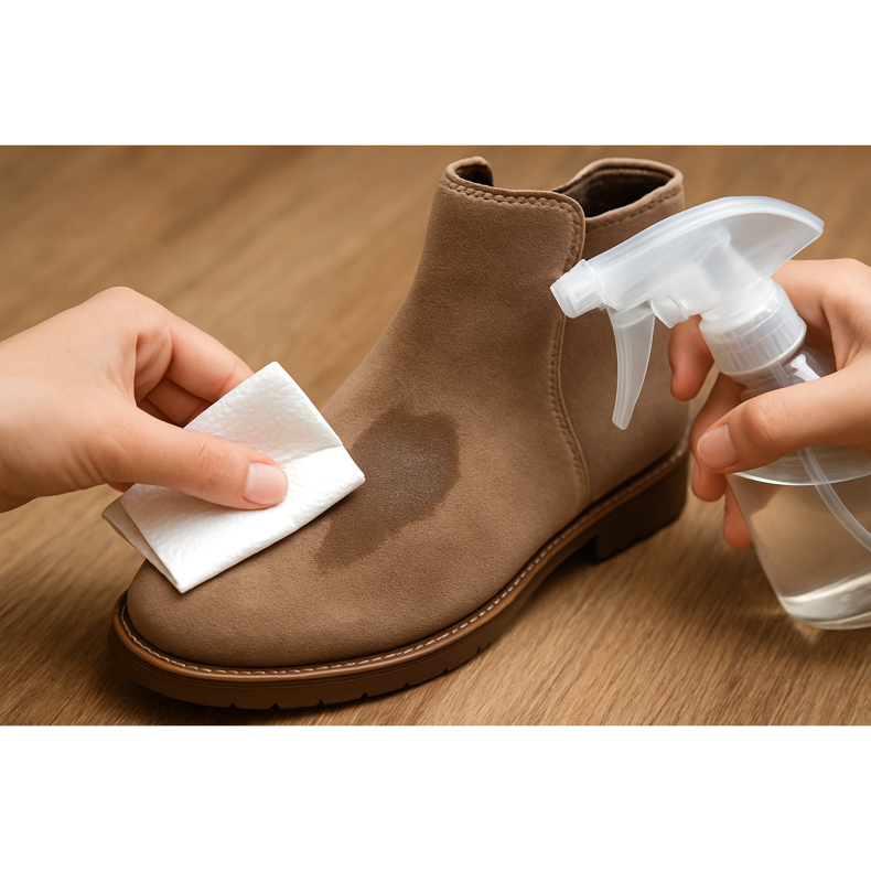 Świeże plamy usuń natychmiast papierowym ręcznikiem przez delikatne tamowanie (nie rozcieraj!). Plamy tłuste posyp natychmiast talkiem, skrobią kukurydzianą lub kredą – pozostaw na kilka godzin, by zaabsorbowały tłuszcz. Plamy wodne (deszcz, śnieg) usuń przez delikatne otamponowanie, a następnie równomierne zwilżenie całego buta czystą wodą z atomizera, by nie powstały smugi. Wyschłe plamy wodne traktuj gumką do zamszu lub delikatną szczotką mosiężną. Zaschnięte błoto: poczekaj aż całkowicie wyschnie, a potem wykrusz ręką i wyszczotkuj szczotką.