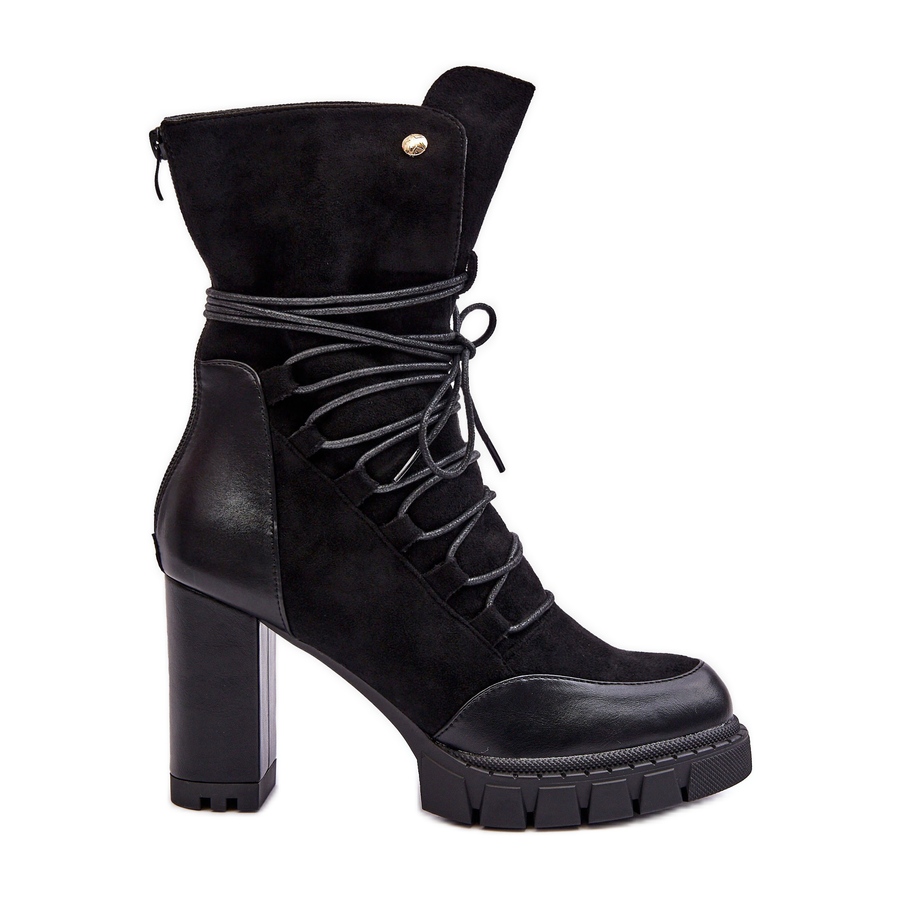 Damskie Botki Na Słupku Z Wiązaniem — czarne, stylowe i wygodne. Osadzone na masywnej platformie i stabilnym słupku (wysokość obcasa: 9,5 cm), idealne na sezon jesień/zima. Wykonane z połączenia skóry ekologicznej i eko zamszu, z ociepleniem w postaci koca obuwniczego — zapewnią ciepło i komfort nawet w chłodniejsze dni. Z tyłu cholewki znajduję się suwak, dodatkowo wiązanie na przodzie pozwala dopasować szerokość. Noski zaokrąglone, zapiętek usztywniony dla lepszej stabilizacji.