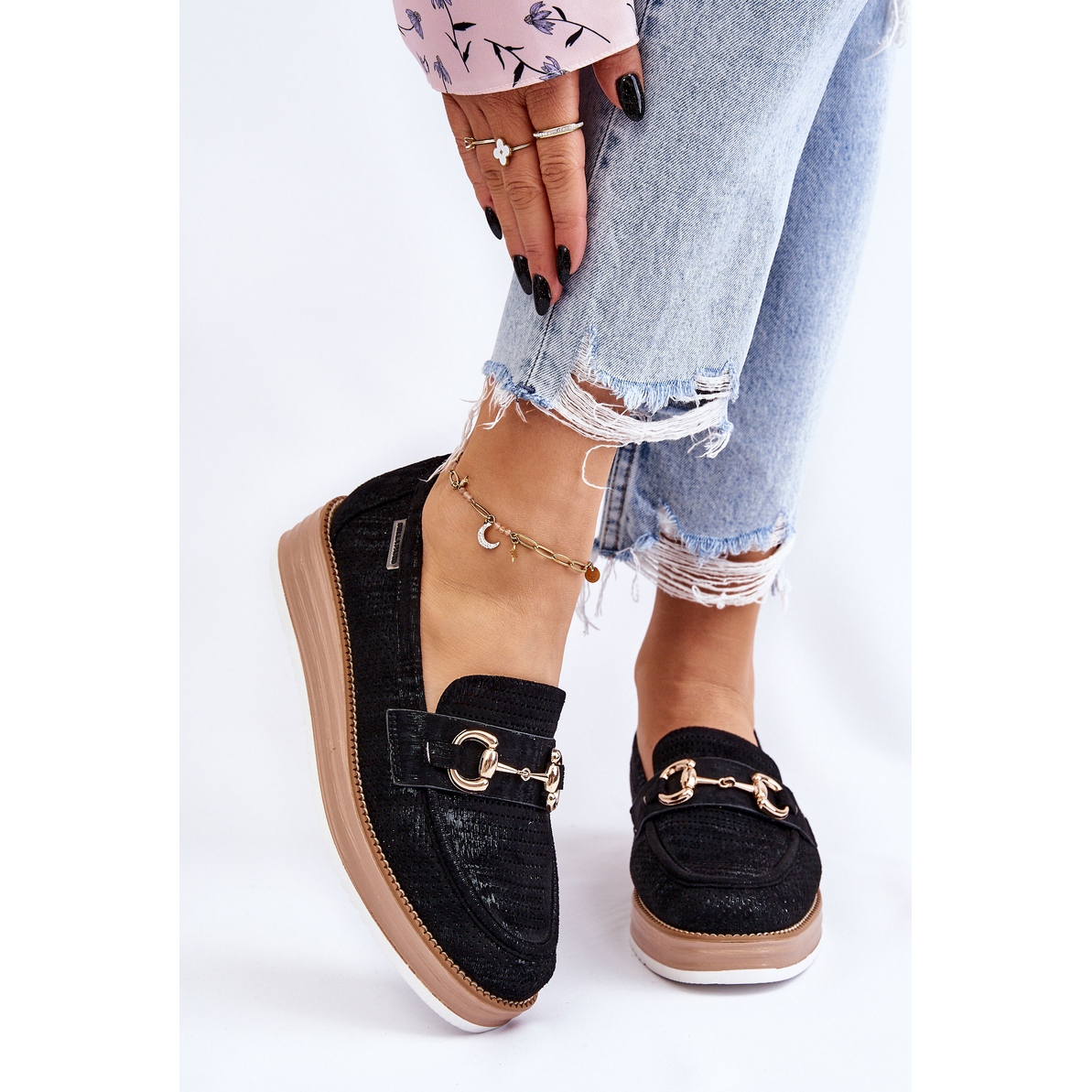 Mokasyny PM1 charakteryzują się usztywnianym zapiętkiem, co dodatkowo zwiększa ich stabilność i komfort noszenia. Ozdobny element na przodzie nadaje im wyjątkowego charakteru, a czarny kolor sprawia, że będą idealnym uzupełnieniem wielu wiosenno-jesiennych stylizacji. Dzięki wysokości cholewki wynoszącej 5,5 cm oraz platformie o wysokości 2,5 cm, buty te nie tylko świetnie wyglądają, ale również optycznie wydłużają nogi.