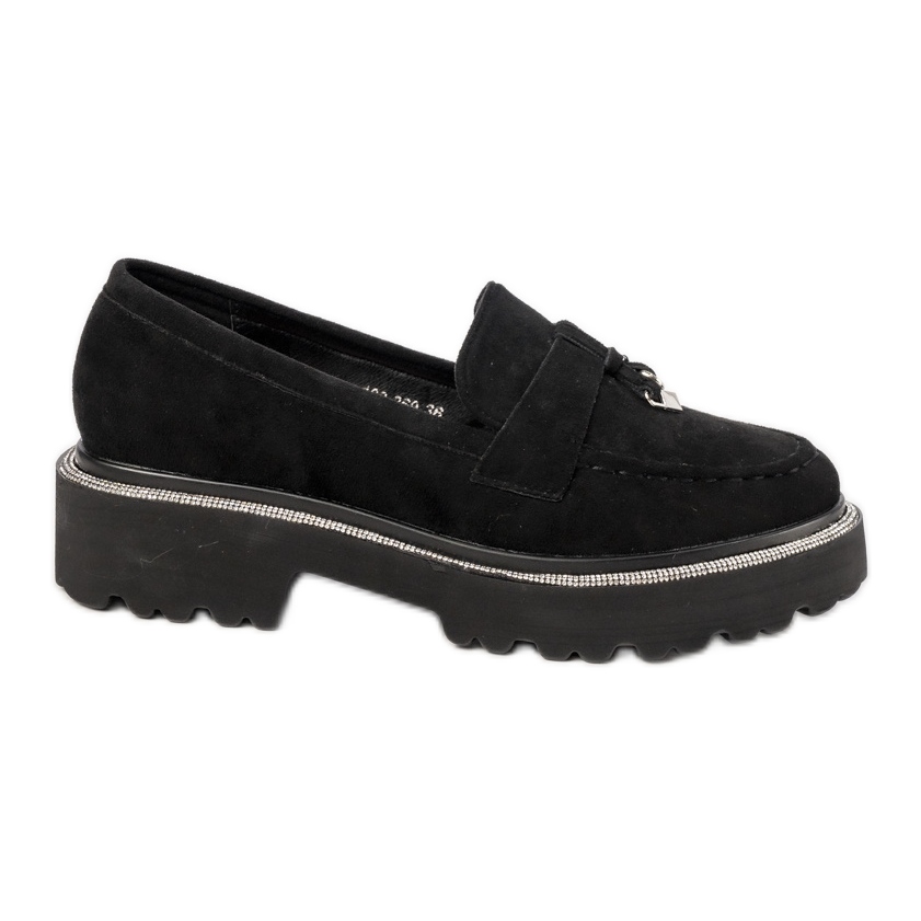 Odkryj niezrównany komfort i elegancję dzięki damskim mokasynom zamszowym czarnym z cyrkoniami. Model BLACK to doskonałe połączenie klasyki z nowoczesnymi detalami, które sprawiają, że te buty stanowią idealny wybór na każdą okazję.