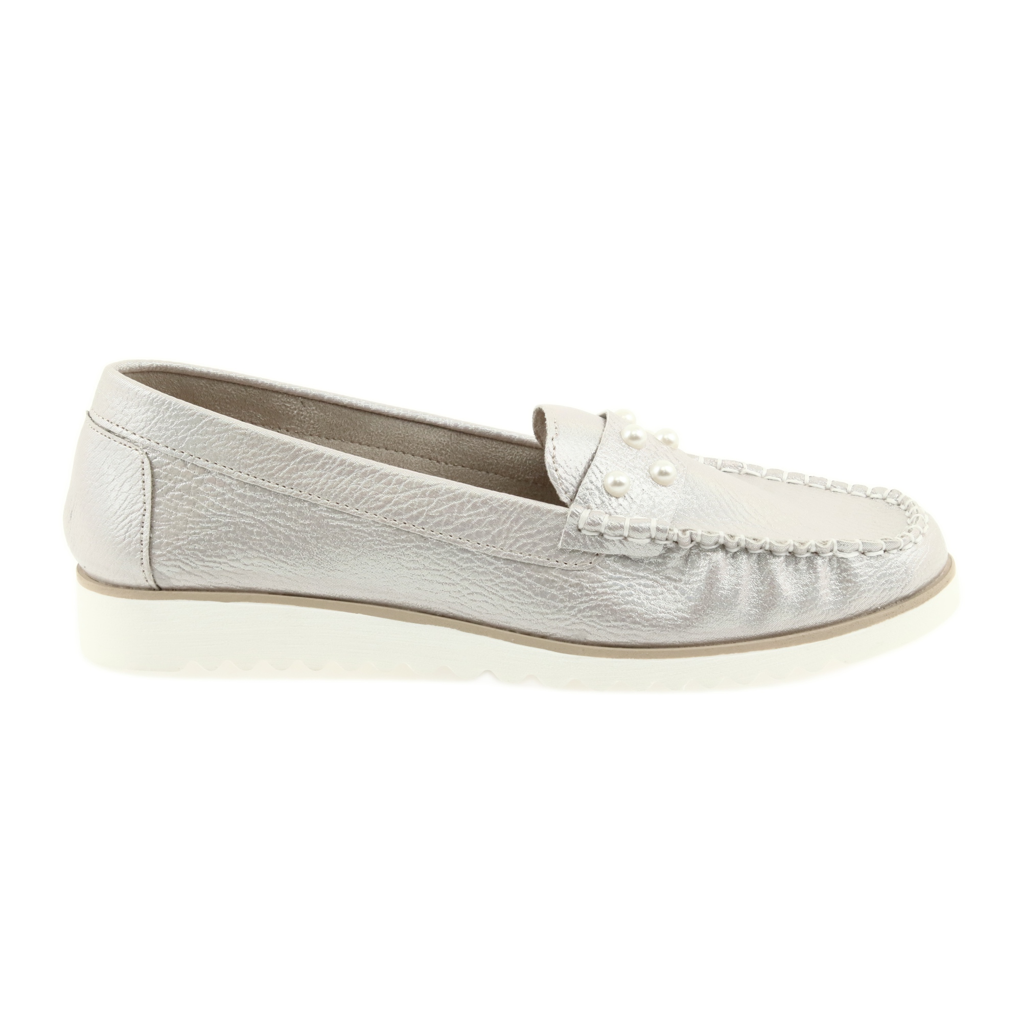 Sergio Leone — damskie mokasyny 725, perlisty beż z białymi i srebrnymi akcentami