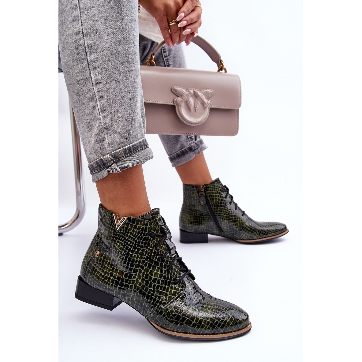 Damskie skórzane botki Maciejka 5743C-09 — zielone, lakierowane, z charakterem. Elegancki fason wykonany z najwyższej jakości skóry naturalnej lakierowanej, łączący klasykę z modnym, zwierzęcym akcentem. Model zapinany na suwak po wewnętrznej stronie cholewki i dodatkowo sznurowany — styl i wygoda w jednym. Płaski, stabilny obcas o wysokości 3 cm oraz migdałowy nosek zapewniają komfort przez cały dzień. Buty sięgają za kostkę (wys. cholewki ok. 10 cm) i świetnie sprawdzą się w wielu jesienno-zimowych stylizacjach (brak ocieplenia).