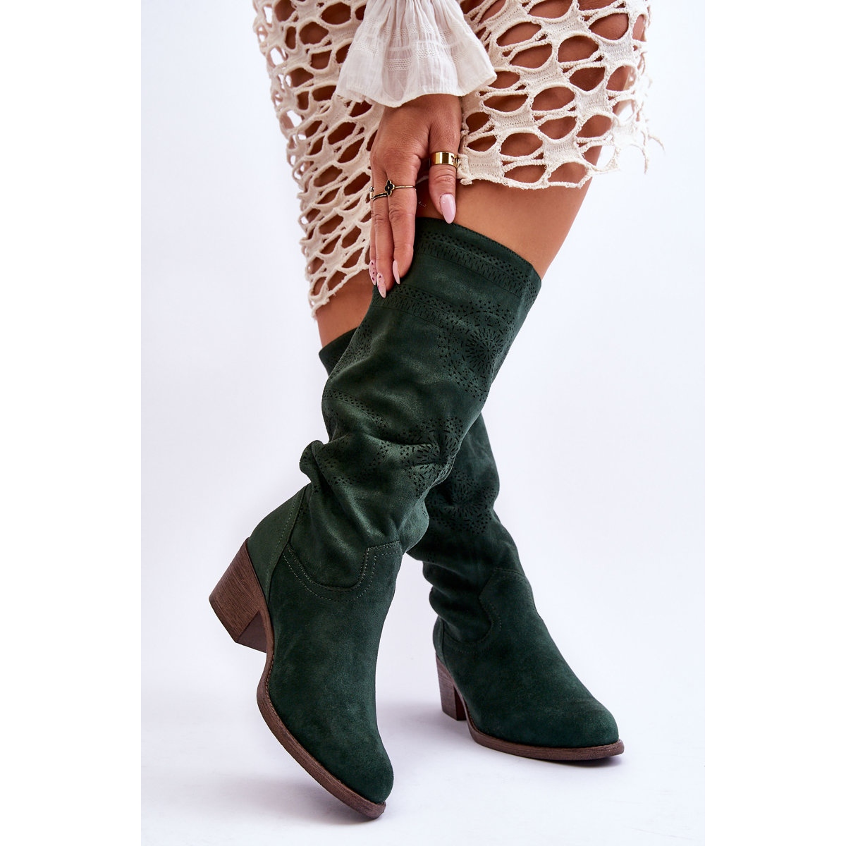 Damskie Zamszowe Kozaki Z Ażurowym Wzorem Zielone Enrissa - Twój Nowy Element Garderoby na Każdą Porę Roku