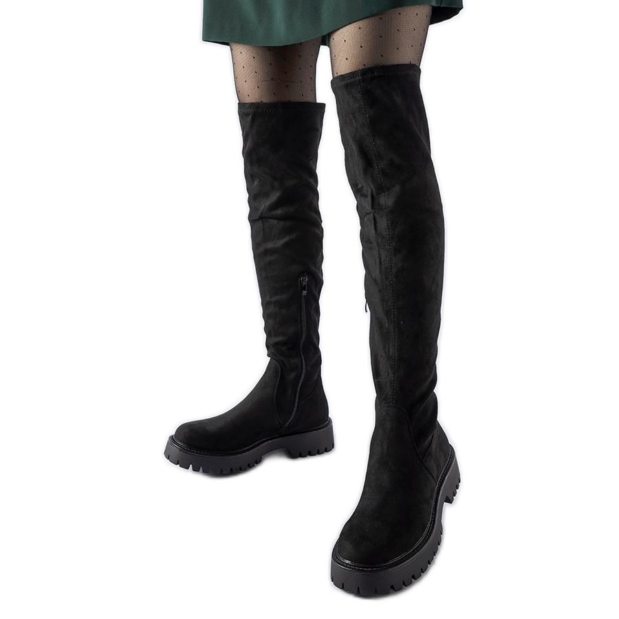- Zewnętrze: skóra ekologiczna zamszowa w kolorze Black — efektowna, matowa faktura nadaje butom uniwersalny styl.