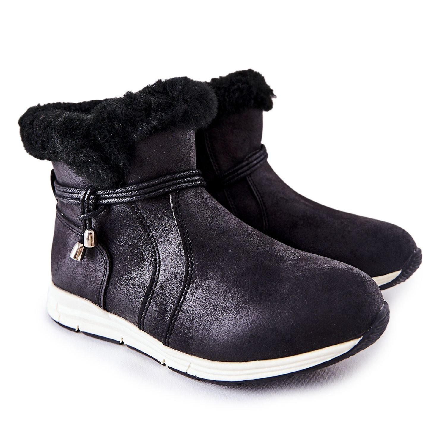 Dziecięce Botki Śniegowce Big Star BB374056BS — czarne, ciepłe i stylowe, idealne na chłodne dni. Wykonane z zamszowej skóry ekologicznej, z ociepleniem w postaci miękkiego koca obuwniczego, zapewniają komfort i ochronę przed zimnem. Zapinane na suwak, z ozdobnym sznureczkiem przy cholewce i logiem Big Star na zamku — praktyczne i estetyczne.