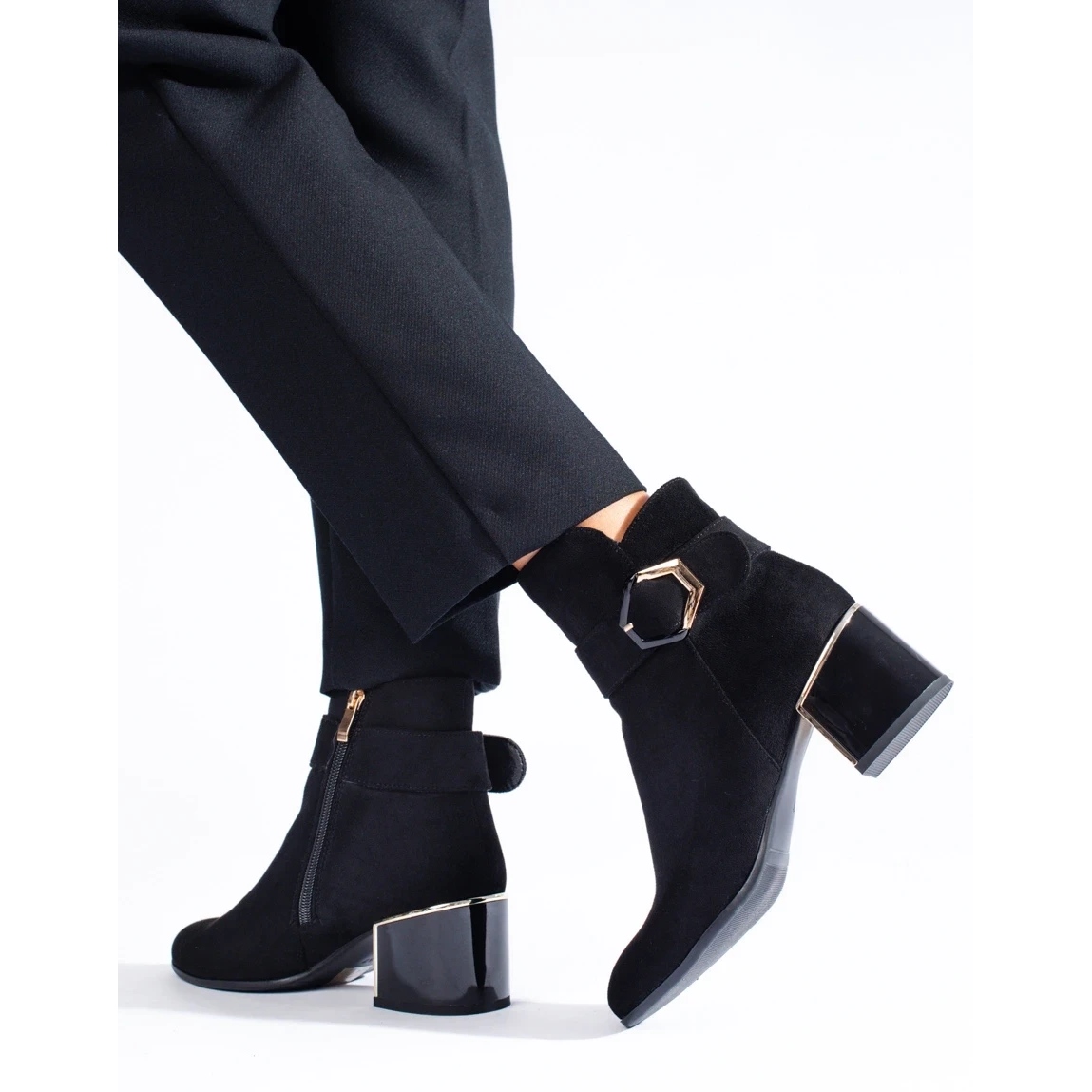 Szczegóły: Eleganckie botki damskie na niskim słupku z zamszu ekologicznego czarne