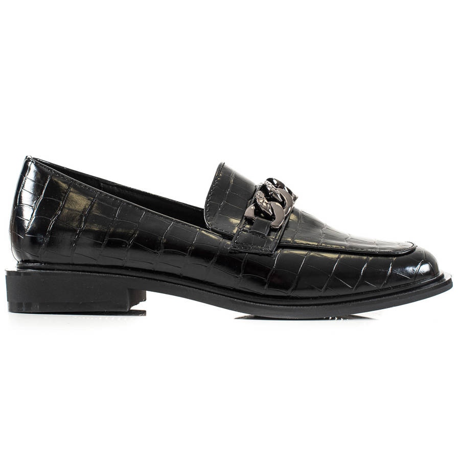 Płaski, usztywniony zapiętek oraz podeszwa z bieżnikiem wykonana z tworzywa sztucznego gwarantują stability i przyczepność. Dodatkowym atutem jest ozdobny łańcuszek oraz dżety, które nadają butom niepowtarzalnego charakteru. Okrągły nosek zwiększa komfort noszenia, a wysokość obcasa wynosząca 2,5 cm sprawia, że są one idealne na dłuższe spacery.