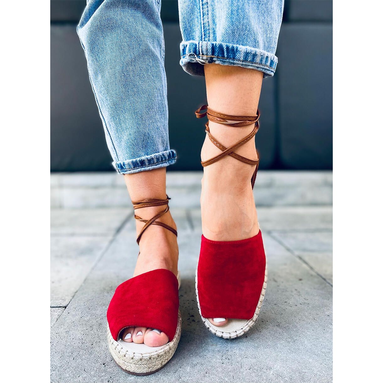 Odkryj letnią elegancję z espadrylami damskimi Andrina Red! Te stylowe, wiązane na kostkę buty to idealna propozycja na ciepłe dni. Charakteryzują się najmodniejszym fasonem typu open toe, który pięknie eksponuje stopy. Zrobione z ekologicznego zamszu oraz skóry ekologicznej, zapewniają nie tylko wygodę, ale także modny wygląd.