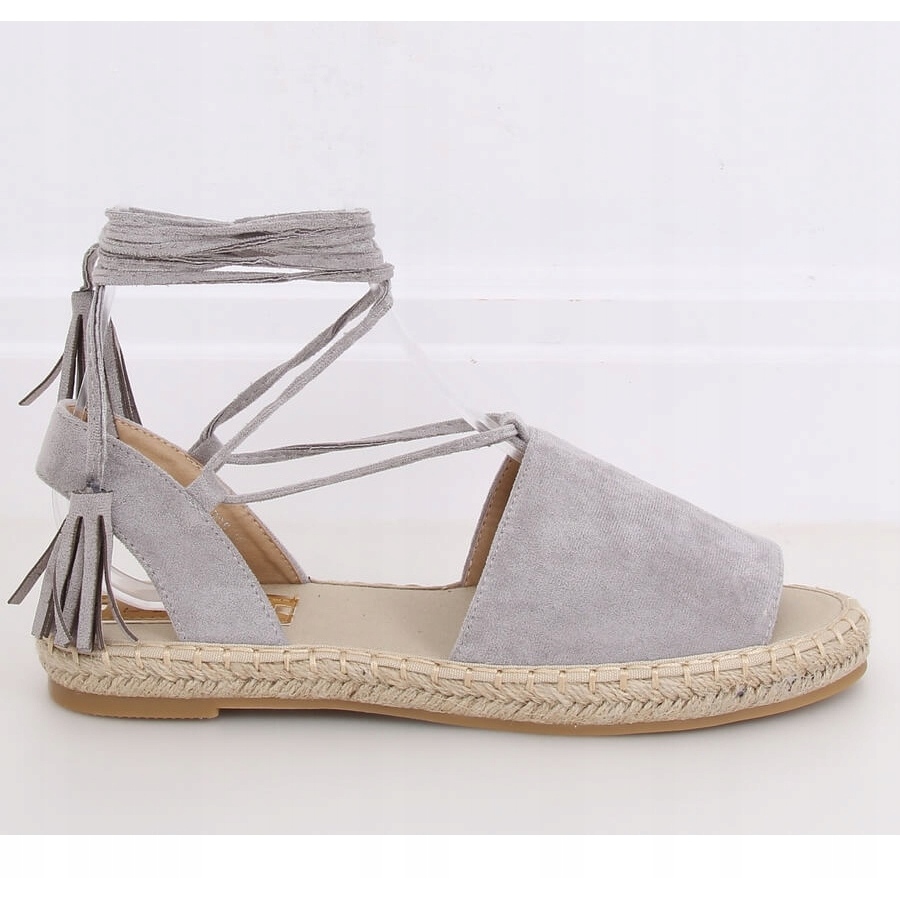 Ich unikalny design wyróżnia pleciona lniana podeszwa, która dodaje lekkości i naturalnego uroku. Wiązanie wykończone frędzelkami efektownie podkreśla kostkę, nadając stylizacji subtelny, boho akcent. Beżowy odcień podeszwy doskonale komponuje się z szarym materiałem zewnętrznym, tworząc spójną i modną całość.