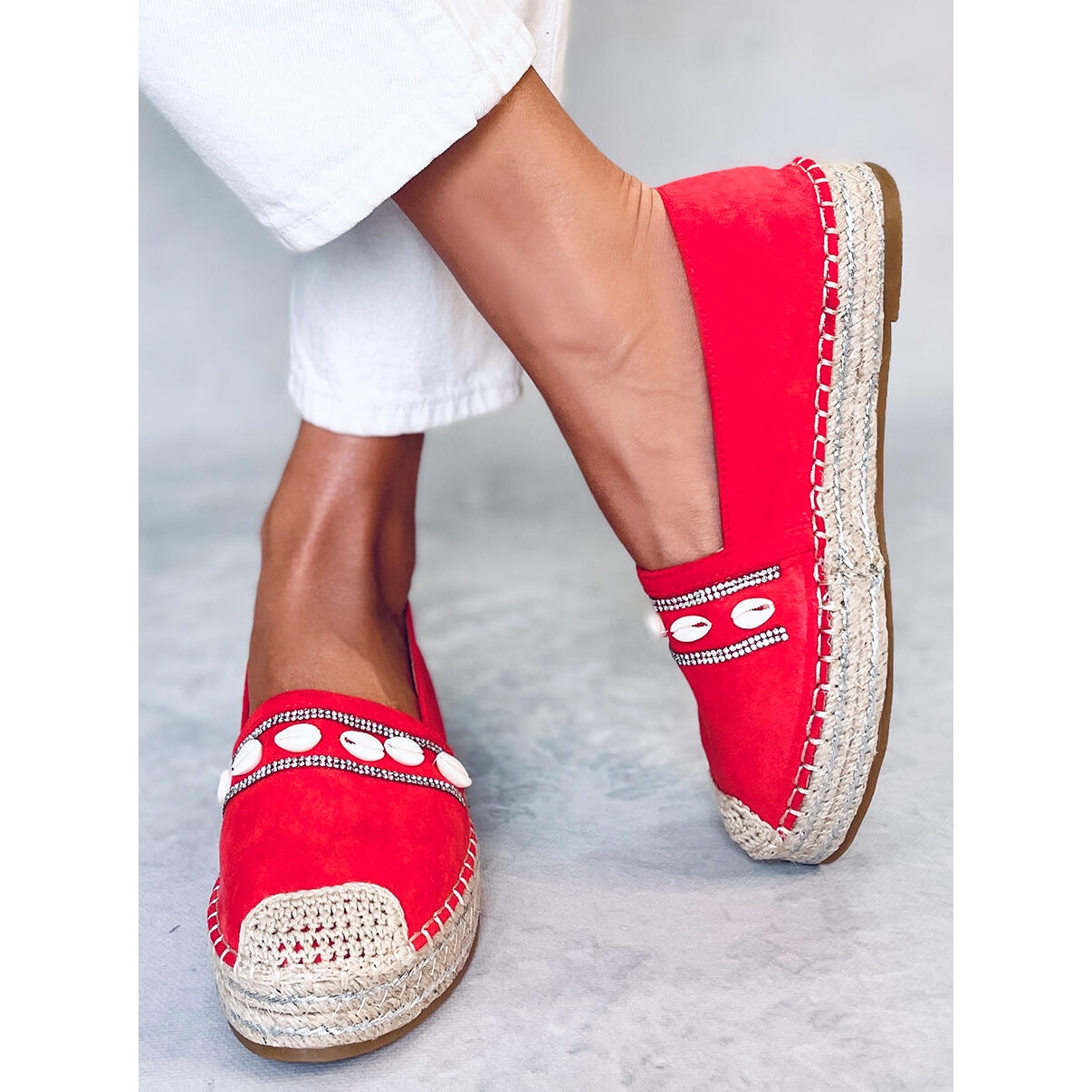 Espadryle charakteryzują się zaokrąglonymi noskami, które są starannie plecione lnianym sznurkiem, co nadaje im wyjątkowy wygląd. Dodatkową atrakcją są piękne aplikacje z błyszczących kamieni oraz muszelek, które świetnie komponują się z intensywnym kolorem obuwia, przyciągając spojrzenia i dodając całej stylizacji letniego klimatu.