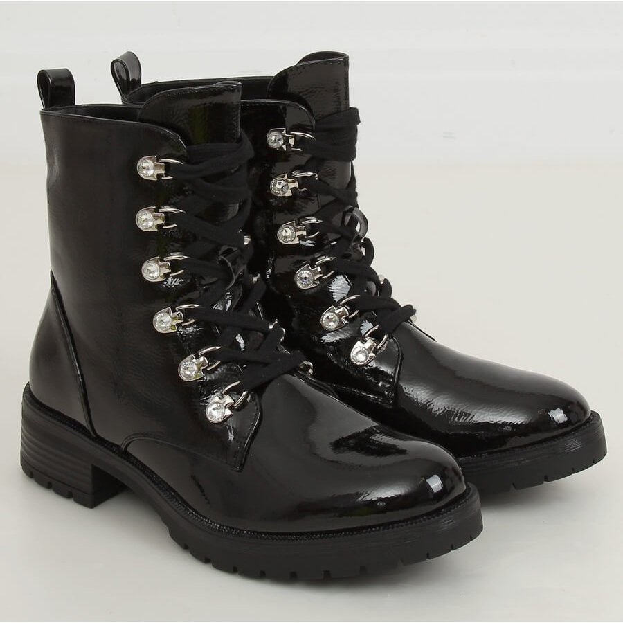 Odkryj wyjątkowe glany lakierowane czarne 7982-PA Black – idealny wybór dla kobiet, które pragną wyróżniać się w tłumie. Te sznurowane botki łączą w sobie odwagę ekstrawagancji oraz elegancki styl, a ich błyszczące akcenty w postaci kamieni zdobiących sznurowania przyciągają uwagę i dodają charakteru każdej stylizacji.
