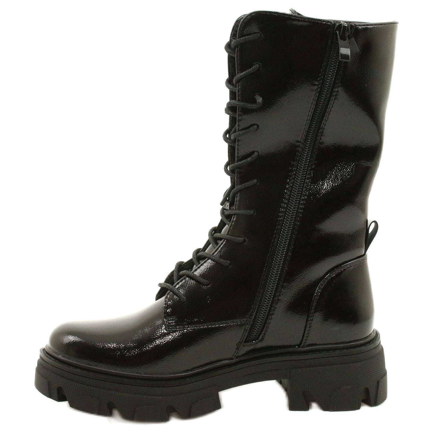 Eleganckie, kobiece glany w nowoczesnym wydaniu. Wykonane z lakierowanej skóry ekologicznej, wykończone miękką, futerkową wkładką i ociepleniem w cholewce — idealne na chłodniejsze dni. Zamykane klasycznie na sznurówki z przodu oraz praktycznym zamkiem bocznym, który ułatwia szybkie zakładanie. Połączenie rockowego charakteru z wygodą codziennego użytkowania.