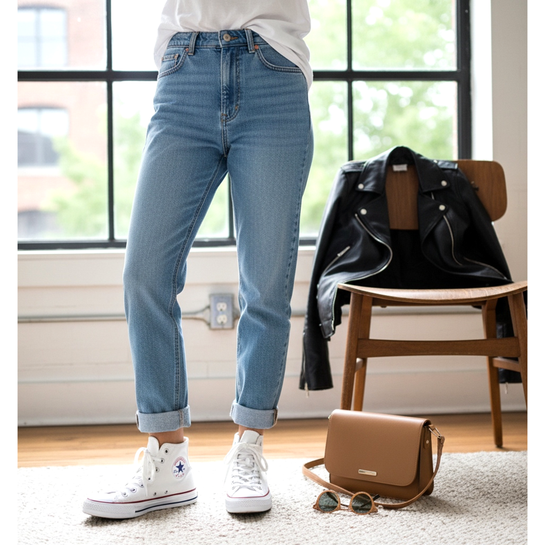 Trik stylistyczny: podwin noganke mom jeans na około 2–4 cm, eksponując kostkę ponad butem. Ten prosty gest natychmiast optycznie wydłuża nogi i nadaje całej stylizacji lekkiego, nonchalant charakteru. Spróbuj tego zestawienia z t-shirtem tuckedm w jeansy i skorzanom kurtką — perfekcyjny look na wiosenny spacer po mieście.