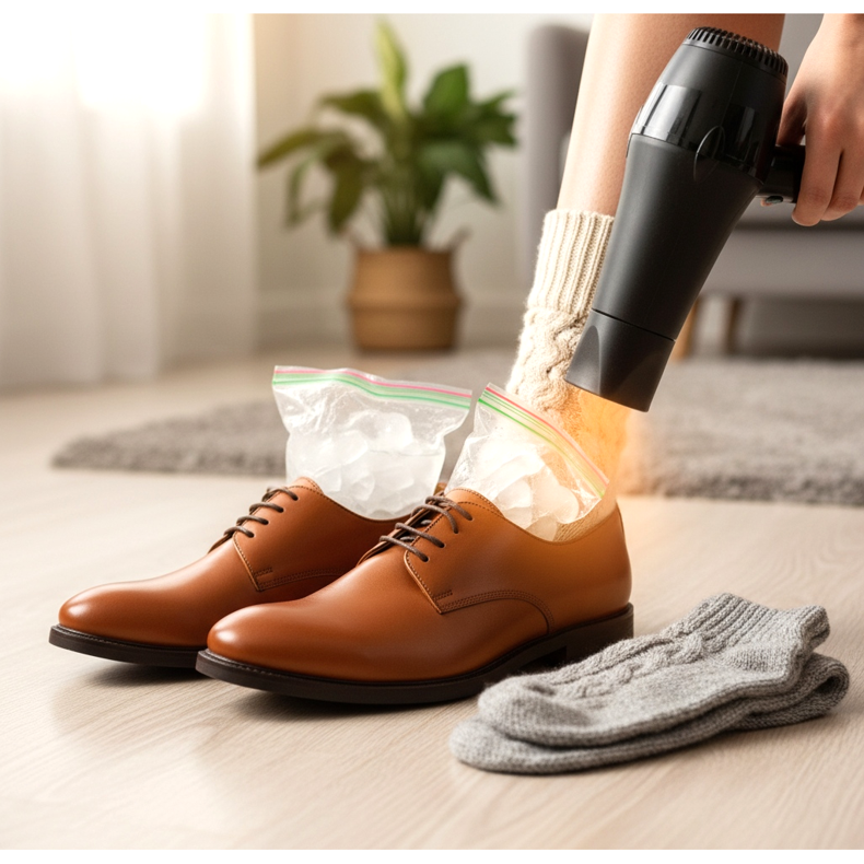 Oryginalny, ale skuteczny: napełnij dwa szczelne woreczki strunowe wodą, włóż je do butów tak, by wypełniły całe wnętrze, a następnie włóż buty do zamrażarki na całą noc. Woda zamarza i rozszerza się, rozciągając materiał od wewnątrz. Po wyjęciu poczekaj aż lód zacznie się roztapiać i dopiero wtedy wyjąć woreczki. Ta metoda działa szczególnie dobrze przy skórzanych butów.