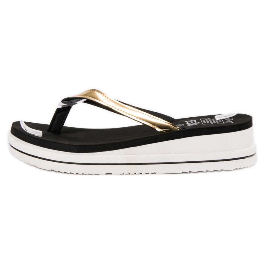 Odkryj idealne buty na lato – czarne japonki na koturnie od SHELOVET! Te eleganckie japonki damskie łączą w sobie komfort i styl, dzięki czemu są doskonałym wyborem zarówno na plażę, jak i na co dzień. O wysokości 4,5 cm, koturn zapewnia odpowiednią stabilność i wygodę podczas chodzenia, a pasek podtrzymujący stopę w kolorze złotym dodaje im niewymuszonego uroku.