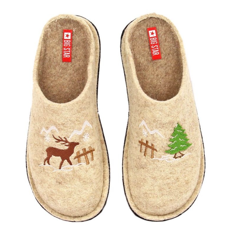 Komfortowe, stylowe kapcie domowe Big Star INT1803A w uniwersalnym beżowym kolorze — idealne na chłodniejsze poranki i wieczory w domu. Wykonane z miękkiego filcu w połączeniu z syntetyczną cholewką, zapewniają przyjemne uczucie miękkości i dobry kontakt z podłożem. Klasyczny, niski fason z okrągłym noskiem i świątecznym haftem dodaje im uroku, a dyskretne logo producenta podkreśla jakość wykończenia.