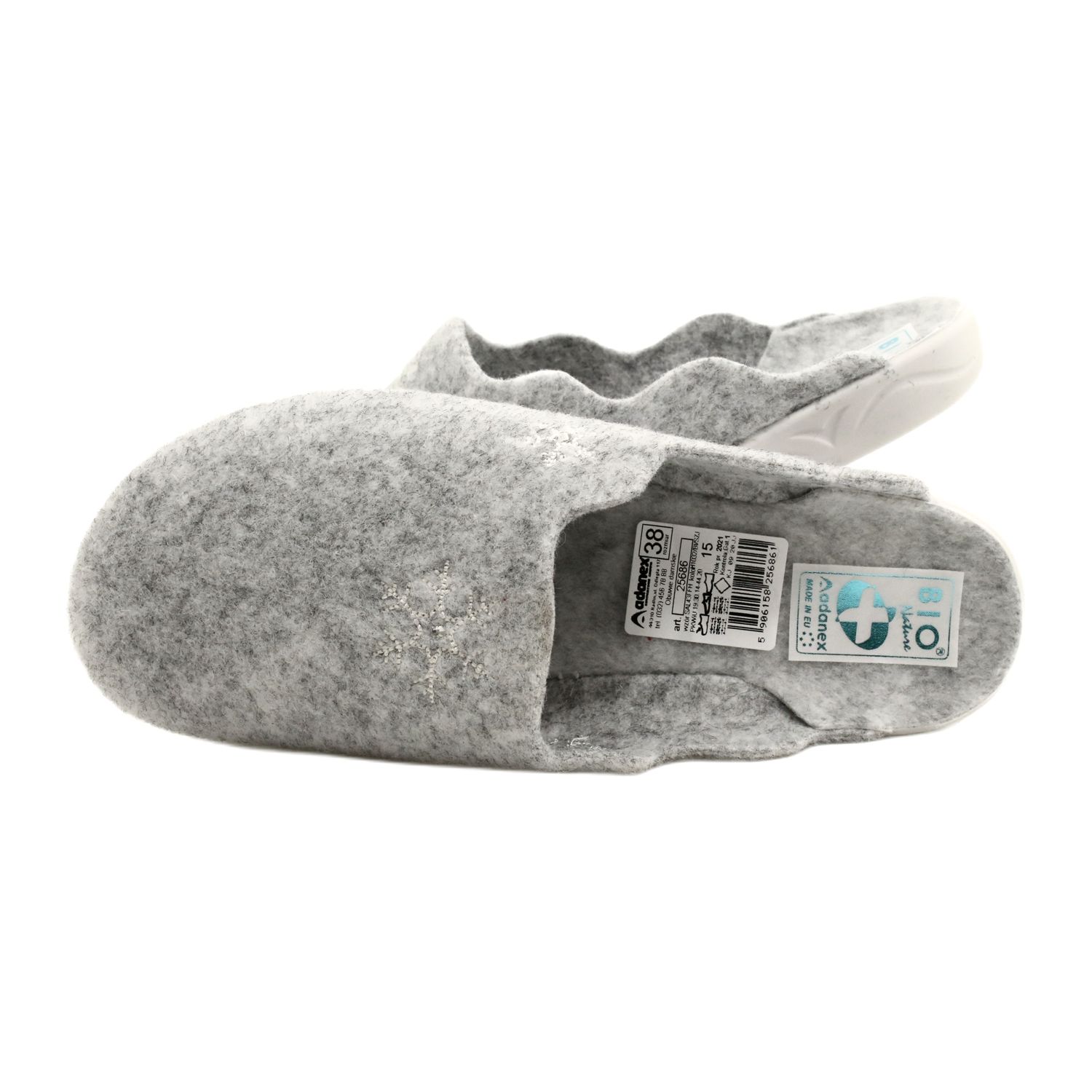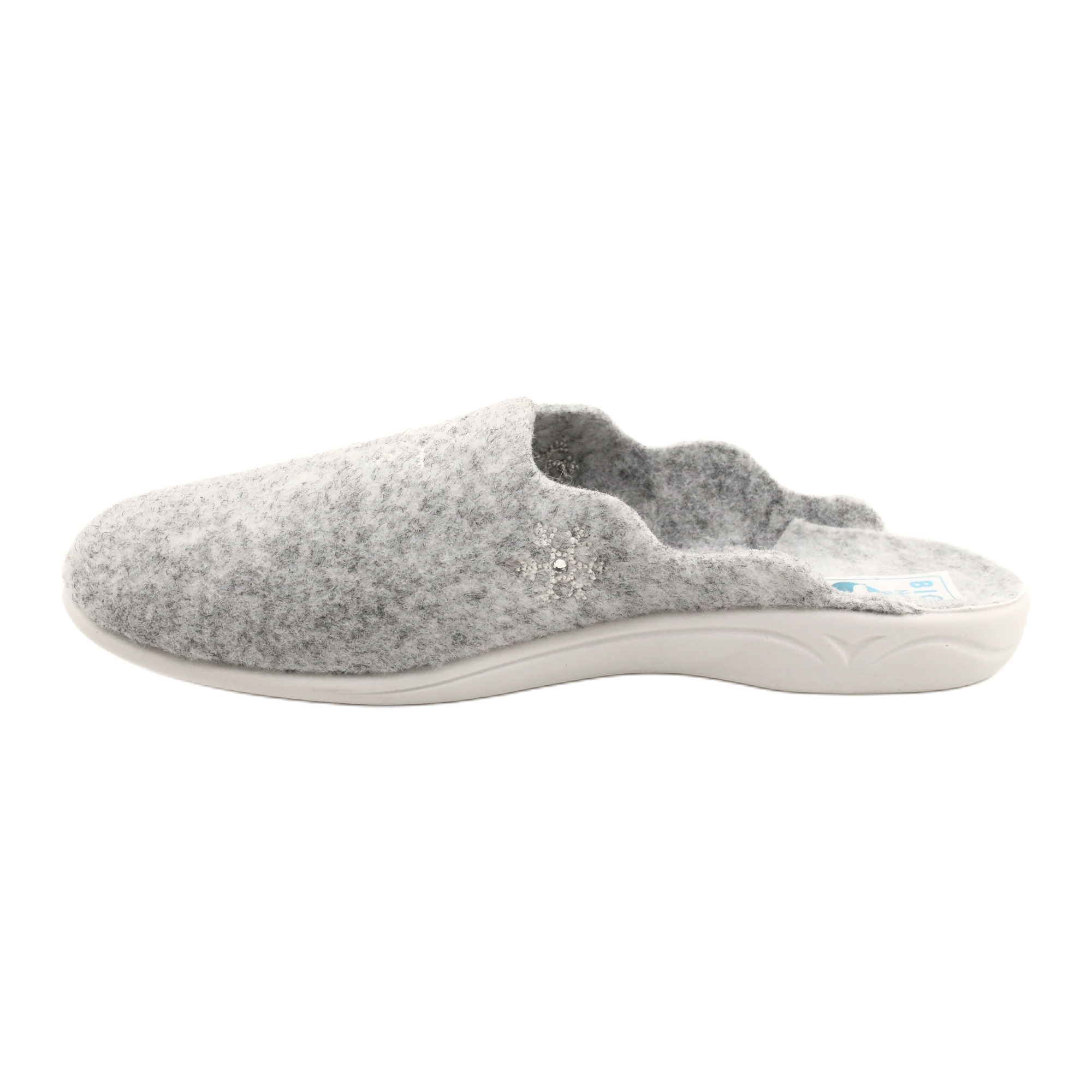 Środek kapci również z filcu zapewnia doskonałą izolację, a podeszwa PU z spienionego materiału syntetycznego pochłania mikrowstrząsy, co sprawia, że każdy krok jest lekki i wygodny. Szara kolorystyka kapci wpasuje się w każdą aranżację wnętrza, a ozdobne cyrkonie dodają im elegancji i stylowego charakteru.