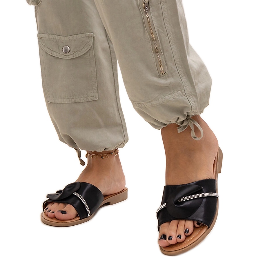 Poznaj klapki zdobione paskiem z cyrkoniami Amari w eleganckim czarnym kolorze. To idealny wybór na gorące letnie dni, łączący w sobie modny design oraz wygodę noszenia. Dzięki okrągłemu noskowi i wsuwanej konstrukcji z gumowymi paskami, zakładanie i zdejmowanie klapek staje się niezwykle proste.