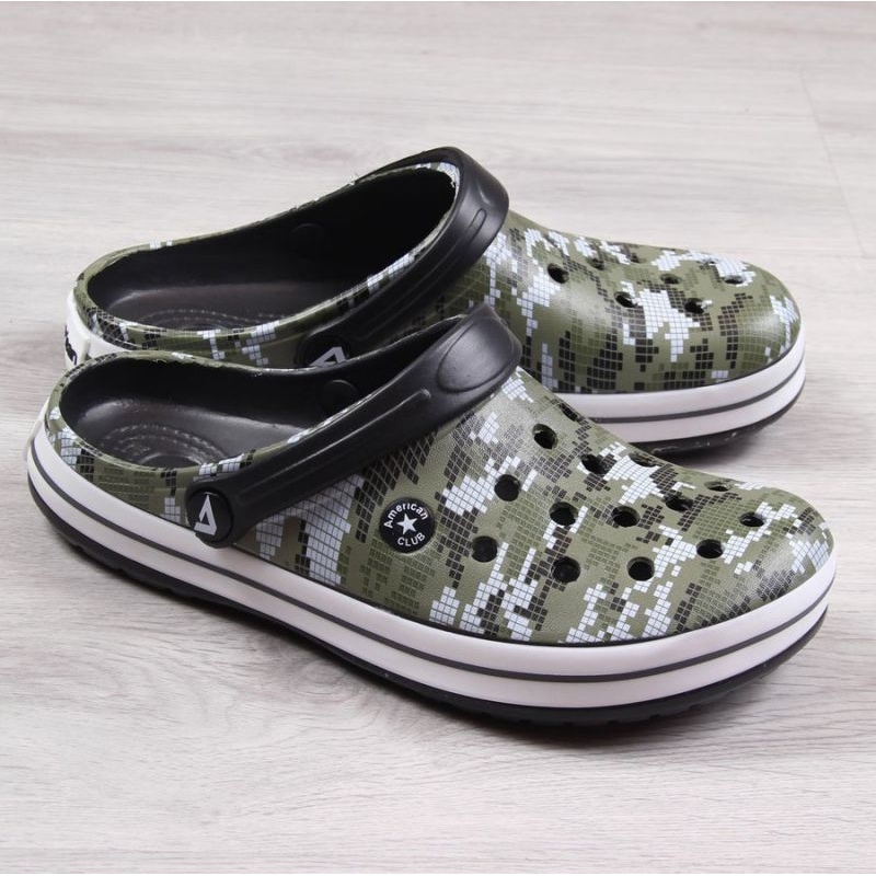 Klapki męskie American Club AM579B w modnym, szarym wzorze moro to praktyczne i lekkie obuwie idealne na basen, plażę i do codziennego użytku w letnie dni. Wykonane z tworzyw sztucznych, z gumową podeszwą i masującą wkładką, łączą komfort z prostą, uniwersalną estetyką.