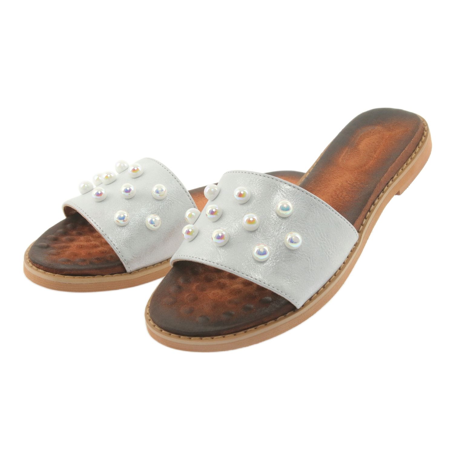 Cholewka tych klapków wyróżnia się ciekawym designem, a pasek z dekoracyjnymi perłami dodaje im wyjątkowego charakteru. Dostępne w eleganckim srebrnym kolorze, idealnie wpisują się w najnowsze trendy. Klapki nie posiadają noska, co zapewnia swobodę oraz komfort podczas codziennych aktywności.