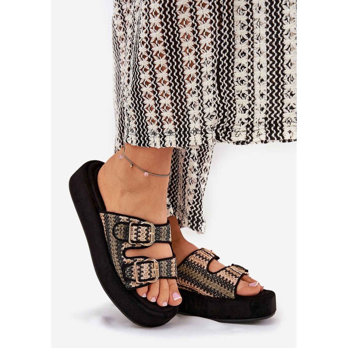 Szczegóły: Klapki Damskie Na Platformie Z Klamrami I Plecionką Czarne