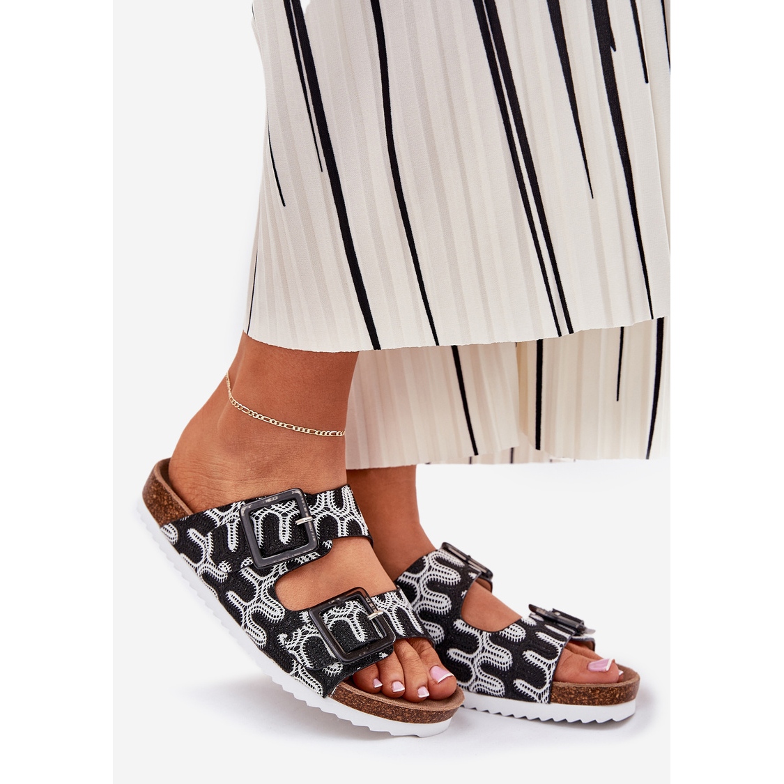 Oto klapki damskie S.Barski RB51-006 w kolorze czarnym, które łączą wygodę, styl i modny design. Wykonane z materiału tekstylnego, wyróżniają się na tle innych modeli dzięki dwóm paskom z klamrami, które są ozdobione brokatem, nadając im unikalnego charakteru. Klapki osadzone są na corkowej platformie o wysokości 3 cm, co zapewnia komfort noszenia przez cały dzień.