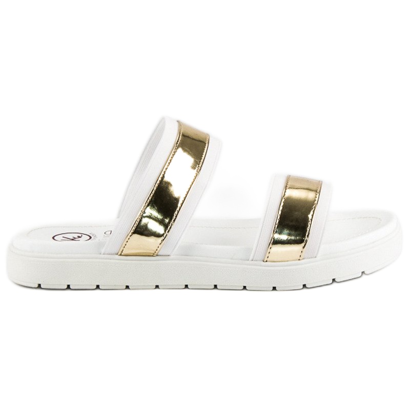 Dwa grube paski, zdobione złotymi elementami, nie tylko przyciągają wzrok, ale także zapewniają stabilne trzymanie na stopie, co czyni je doskonałym wyborem na co dzień. Dzięki otwartemu zapiętkowi oraz wsuwanej konstrukcji, ich zakładanie jest szybkie i intuicyjne, a gumowa podeszwa z bieżnikiem gwarantuje przyczepność na różnych nawierzchniach.