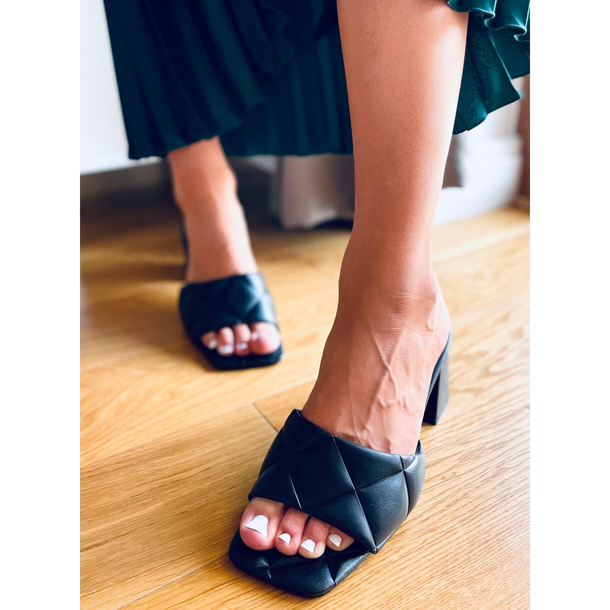 Odkryj elegancję i komfort w klapkach na szerokim obcasie Helen Black! Te czarne klapki damskie o wysokości 7,5 cm to idealne uzupełnienie każdej stylizacji, które doskonale sprawdzi się zarówno na co dzień, jak i na wyjątkowe okazje. Ich modny, kwadratowy fason oraz efektowny pikowany wzór przyciągają wzrok i dodają klasy.