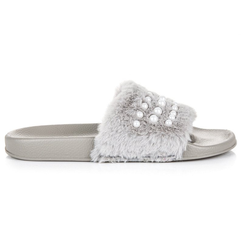 Szczegóły: Klapki z futerkiem i perełkami szare