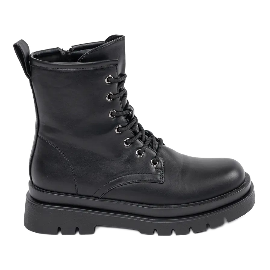 Usztywniony, zabudowany zapiętek oraz okrągły nosek gwarantują wygodę i stabilność, natomiast płaski obcas o wysokości 5 cm i platforma 3 cm sprawiają, że chodzenie w tych butach to czysta przyjemność. Dzięki szerokości cholewki wynoszącej 22 cm i wzorowi bez dodatkowych nadruków, traperki dopasowują się do różnych typów sylwetek.