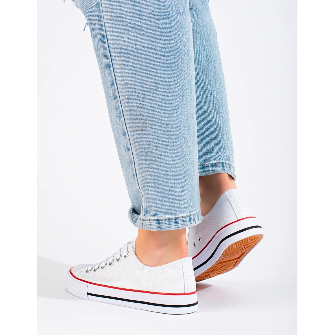 Uniwersalne, białe trampki damskie w klasycznym kroju — idealne na co dzień. Wykonane w całości z tkaniny, z tekstylną wkładką i miękkim, zabudowanym zapiętkiem dla komfortu. Sznurowane, niskie, z gumową podeszwą z bieżnikiem, łączą sportowy charakter z casualową elegancją.