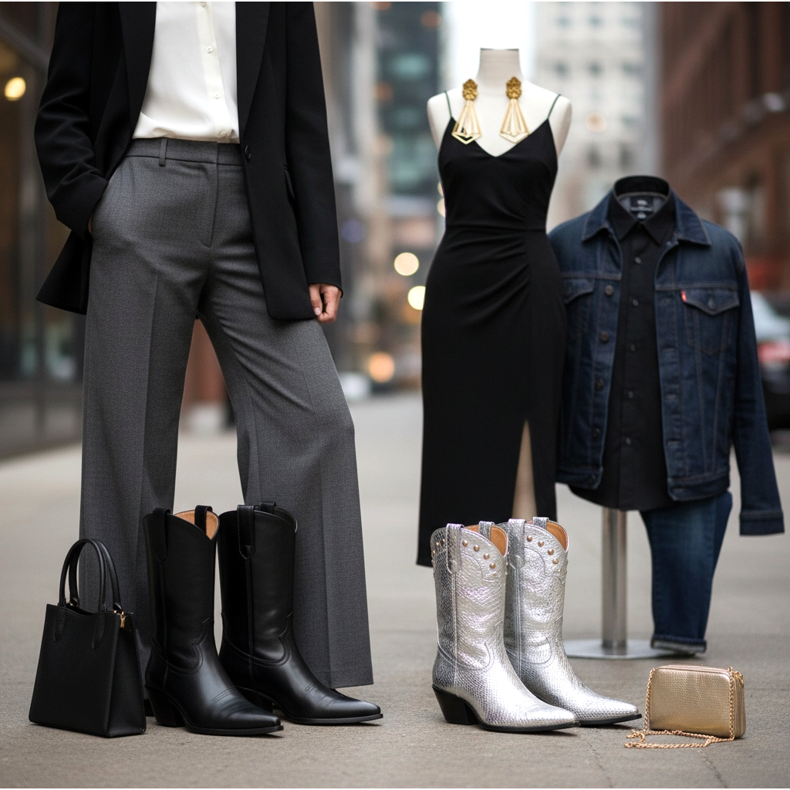 Na wieczorne wyjścia postaw na kowbojki z błyszczącego materiału lub z metalicznymi detalami. Złote lub srebrne western boots w połączeniu z czarną sukienką midi tworzą dramatyczny, ale szykowny efekt. Nie zapomnij o odpowiednich dodatkach — duze kolczyki i minimalistyczna torebka na łańcuszku uzupełnią tę stylizację.