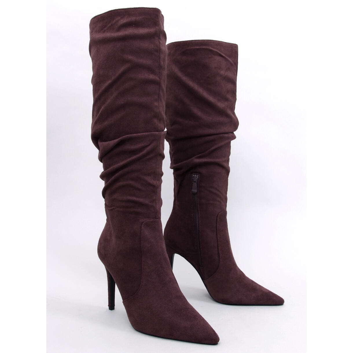 Eleganckie, zamszowe kozaki na wysokiej szpilce, które doskonale łączą klasyczny fason z nowoczesnymi detalami. Zwężający się, szpiczasty nosek pięknie wysmukla sylwetkę, a modnie marszczona cholewka dodaje charakteru. Idealne do codziennych i bardziej eleganckich stylizacji — od sukienek po dopasowane jeansy.