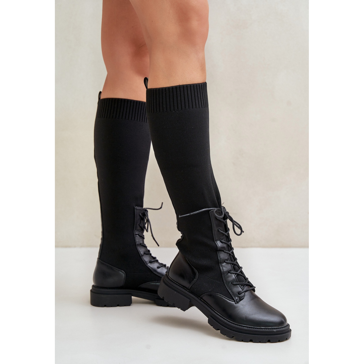 Kozaki mają wysokość cholewki wynoszącą 40 cm oraz płaski obcas o wysokości 3,5 cm, co sprawia, że są zarówno eleganckie, jak i praktyczne. Są dostępne w klasycznym czarnym kolorze, co pozwala na łatwe zestawienie ich z różnorodnymi outfitami. Zapięcie w postaci sznurowania oraz możliwości wsuwania dodaje im wszechstronności.