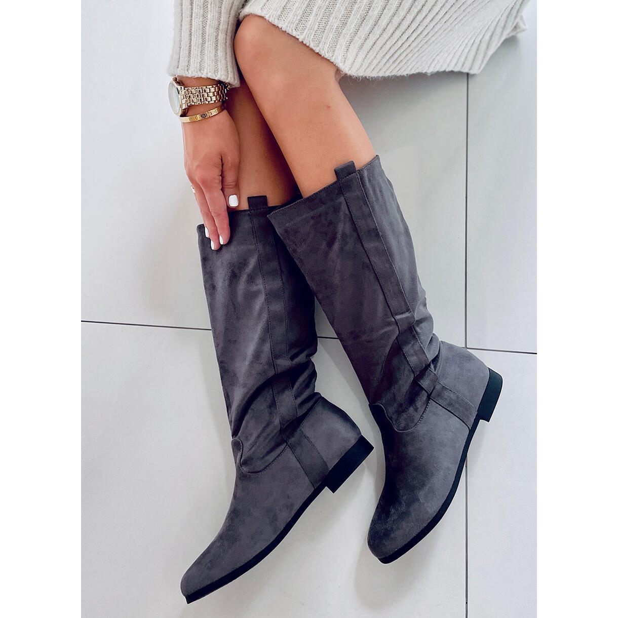 Odkryj wygodę i styl z kozakiem Flatty Grey od PA1! Te eleganckie, płaskie kozaki z zamszu ekologicznego w klasycznym szarym odcieniu będą doskonałym dodatkiem do każdej codziennej stylizacji. Prosta cholewka oraz okrągły nosek sprawiają, że ich zakładanie jest szybkie i komfortowe, co czyni je idealnym wyborem na chłodniejsze dni.