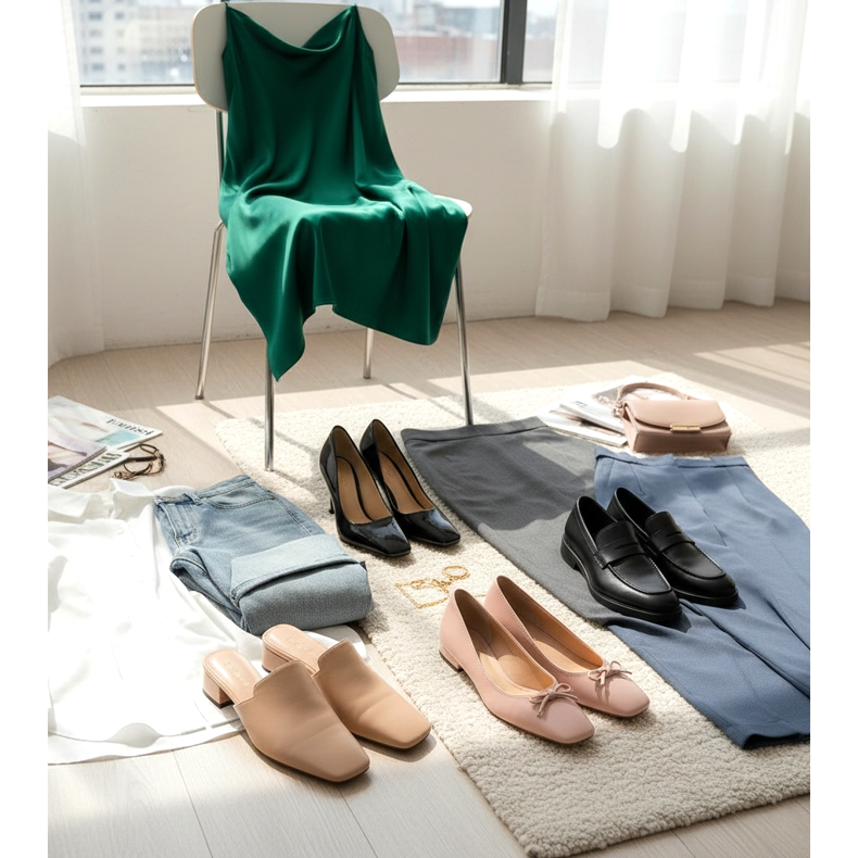 Do biura — zestaw baleriny lub loafersy z kwadratowym noskiem ze spódnicą ołówkową lub spodniami cygaretkami. Ten zestaw to kwintesencja profesjonalnego power loogu 2026 roku. Wybierz kolor buta zbliżony do dolłą stroju, by wydłużyć nogi optycznie.