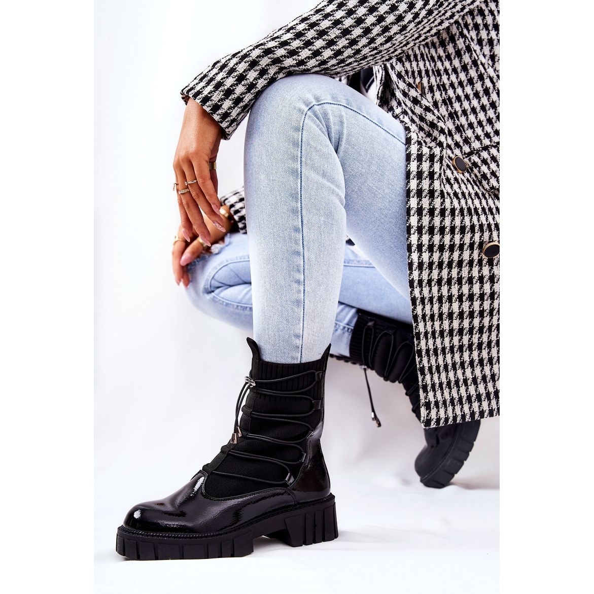 Szczegóły: PL4 Lakierowane Botki Workery Ze Skarpetą Czarne Connor