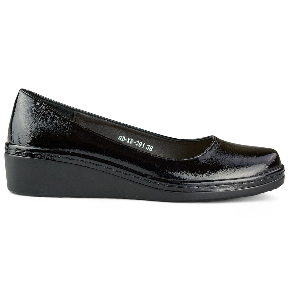 Szczegóły: Lakierowane czarne czółenka półbuty damskie na niskiej koturnie
