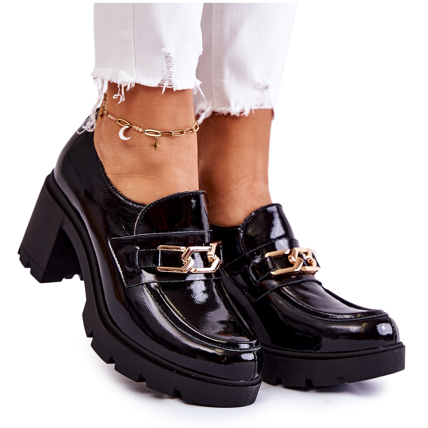 Szczegóły: PL5 Lakierowane Półbuty Na Słupku Ze Złotą Ozdobą Czarne Mikeyla