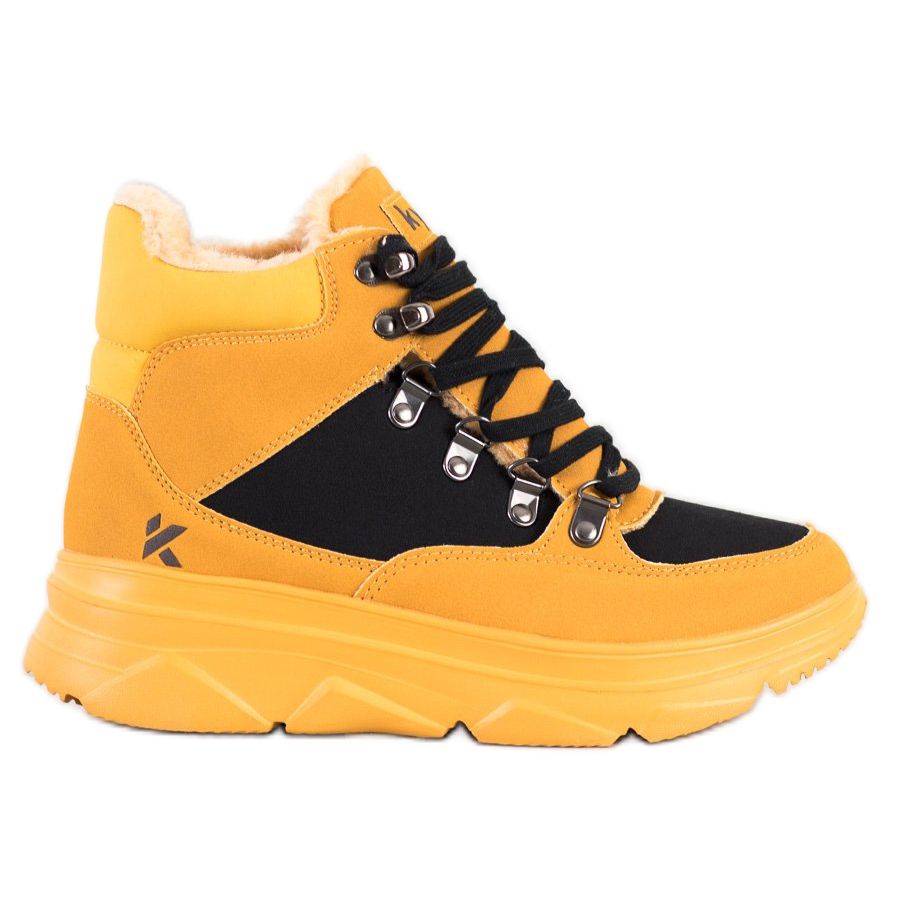 Oto idealne obuwie na chłodniejsze dni – lekkie sportowe trapery na platformie od producenta Kylie. Charakteryzują się one modnym połączeniem kolorystycznym czarnego i żółtego, które przyciąga wzrok i doskonale wpisuje się w najnowsze trendy.