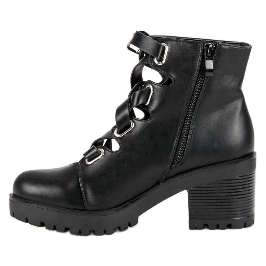 Botki posiadają wysoką cholewkę, co zapewnia dodatkowe ciepło w chłodniejsze dni, a komfort noszenia podnoszą tekstylne wkładki. Nietypowe sznurowanie oraz grubszy obcas w postaci słupka nadają obuwiu drapieżny i rockowy styl, idealny dla odważnych kobiet. Okrągły nosek dodaje subtelności, sprawiając, że buty te są nie tylko stylowe, ale i wygodne.